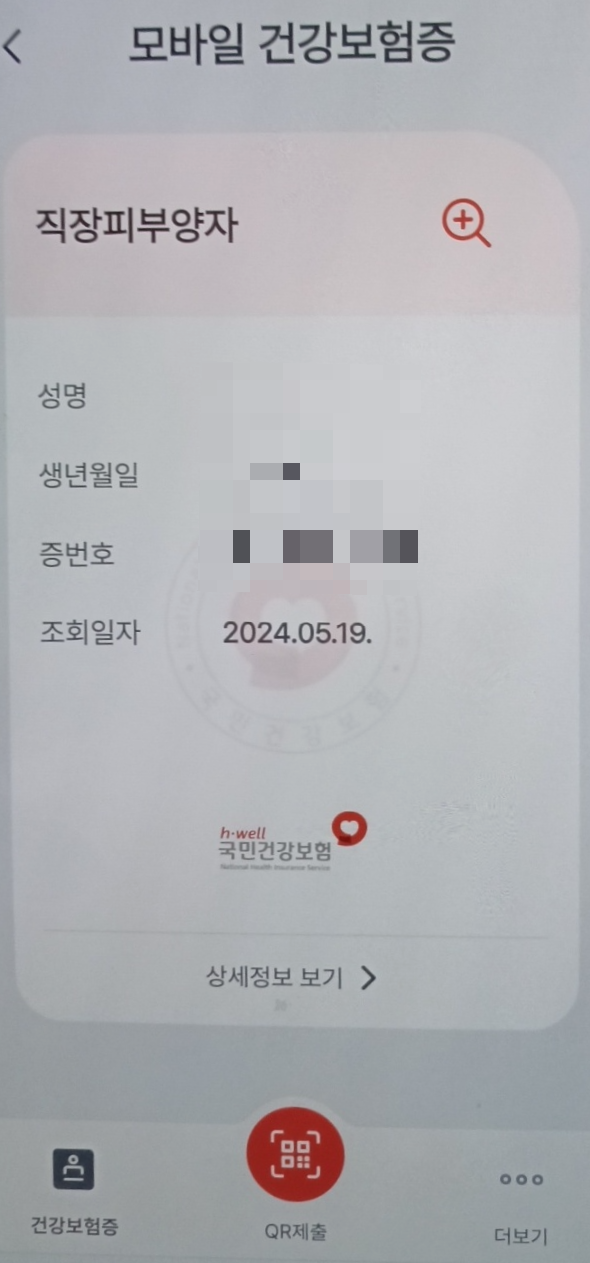 11. 메인 화면에서 왼쪽 건강보험증 버튼을 클릭하면 모바일 건강보험증이 나옵니다.
