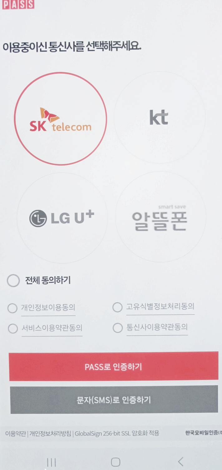 8. 핸드폰 진행시 PASS앱 또는 문자로 인증하기로 본인확인하기